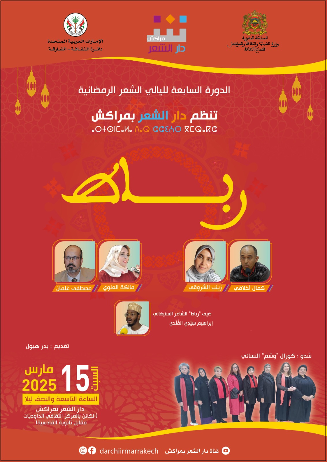ويشارك في لقاء السبت الشعراء: مالكة العلوي ومصطفى غلمان، وزينب الشروقي وكمال أخلاقي، في فقرة ثنائيات رباط، الى جانب مشاركة الشاعر السينغالي ابراهيم سيدي الفلدي، والذي يشرف على تقديم فقراتها الشاعر بدر هبول فيما ستحيي فرقة كورال “وشم” النسائية الحفل الفني لهذه التظاهرة.