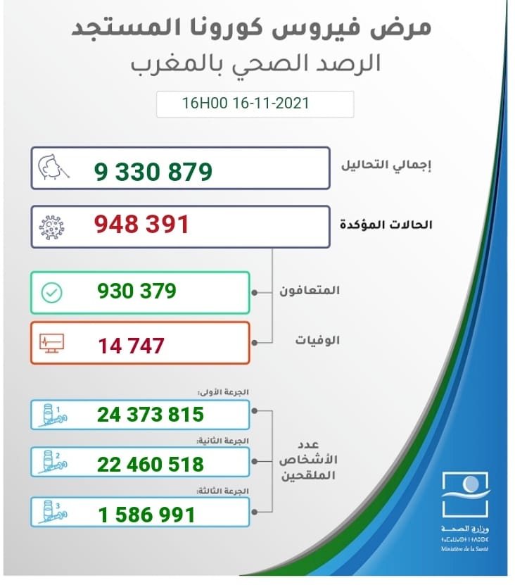 أفادت نشرة كوفيد اليومية التي تصدرها مصالح وزارة الصحةن أنه وفق آخر مستجدات الحالة الوبائية لفيروس كورونا بـالمغرب، خلال الـ 24 ساعة الأخيرة، وذلك إلى حدود الساعة الرابعة بعد زوال يوم الثلاثاء 16 نونبر 2021، أنه تم تسجيل 120 حالة جديدة مؤكدة الإصابة ليصل العدد إلى 948.391، في حين تم تسجيل وفاة واحدة ليصل المجموع إلى 14.747، كما أنه تم تسجيل 143 حالة تعافي ليصل العدد إلى 930379.