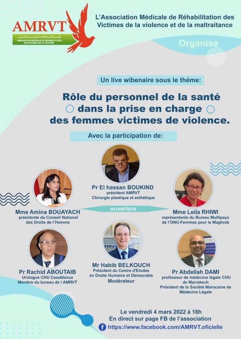 احتضنت الجمعية الطبية لإعادة تأهيل ضحايا العنف وسوء المعاملة، يومه الأحد 06 مارس الجاري، عبر تقنية التناظر (عن بعد). حول موضوع “دور مهنيي الصحة في محاربة العنف ضد النساء”.