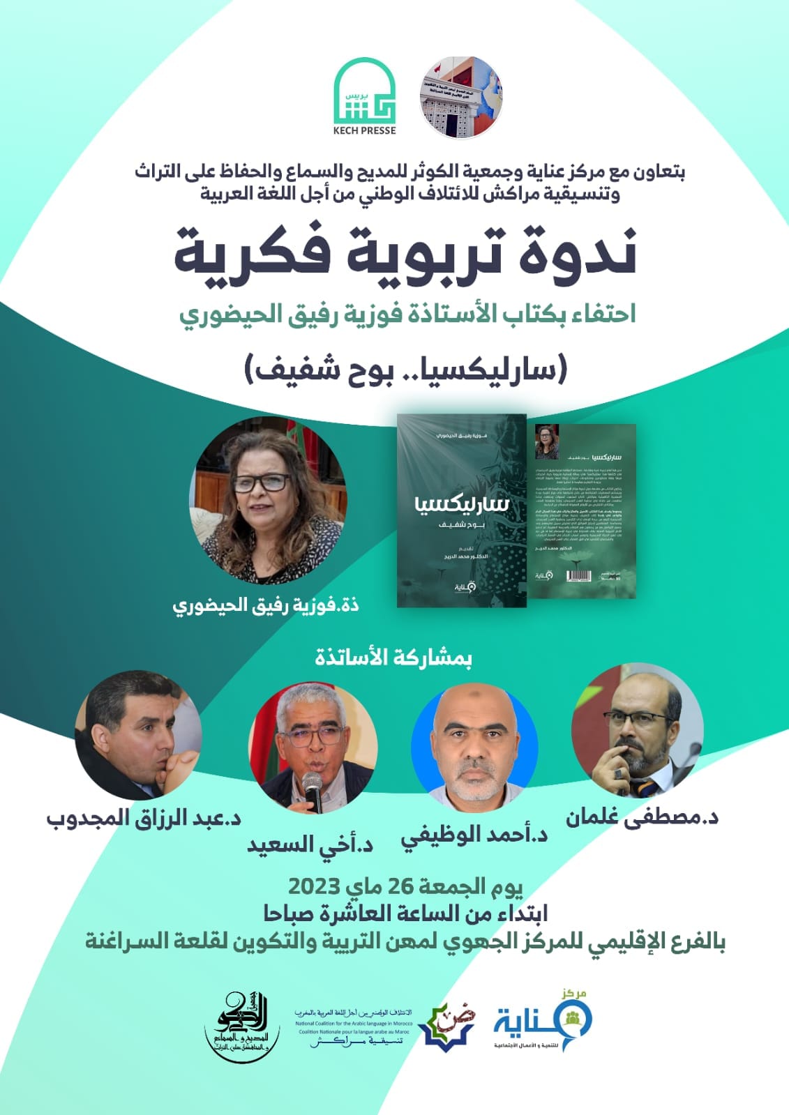ينظم الفرع الإقليمي للمركز الجهوي لمهن التربية والتكوين بمدينة قلعة السراغنة، بشراكة وتنسيق مع مؤسسة “كش بريس” الإعلامية وبتعاون مع مركز عناية وجمعية الكوثر والتنسيقية الجهوية للائتلاف الوطني من أجل اللغة العربية بمراكش، لقاء فكريا تربويا على شرف الأستاذة الشاعرة والباحثة فوزية رفيق الحيضوري، وتقديم كتابها الفريد والنوعي” “سارليكسيا ،، بوح شفيف” .