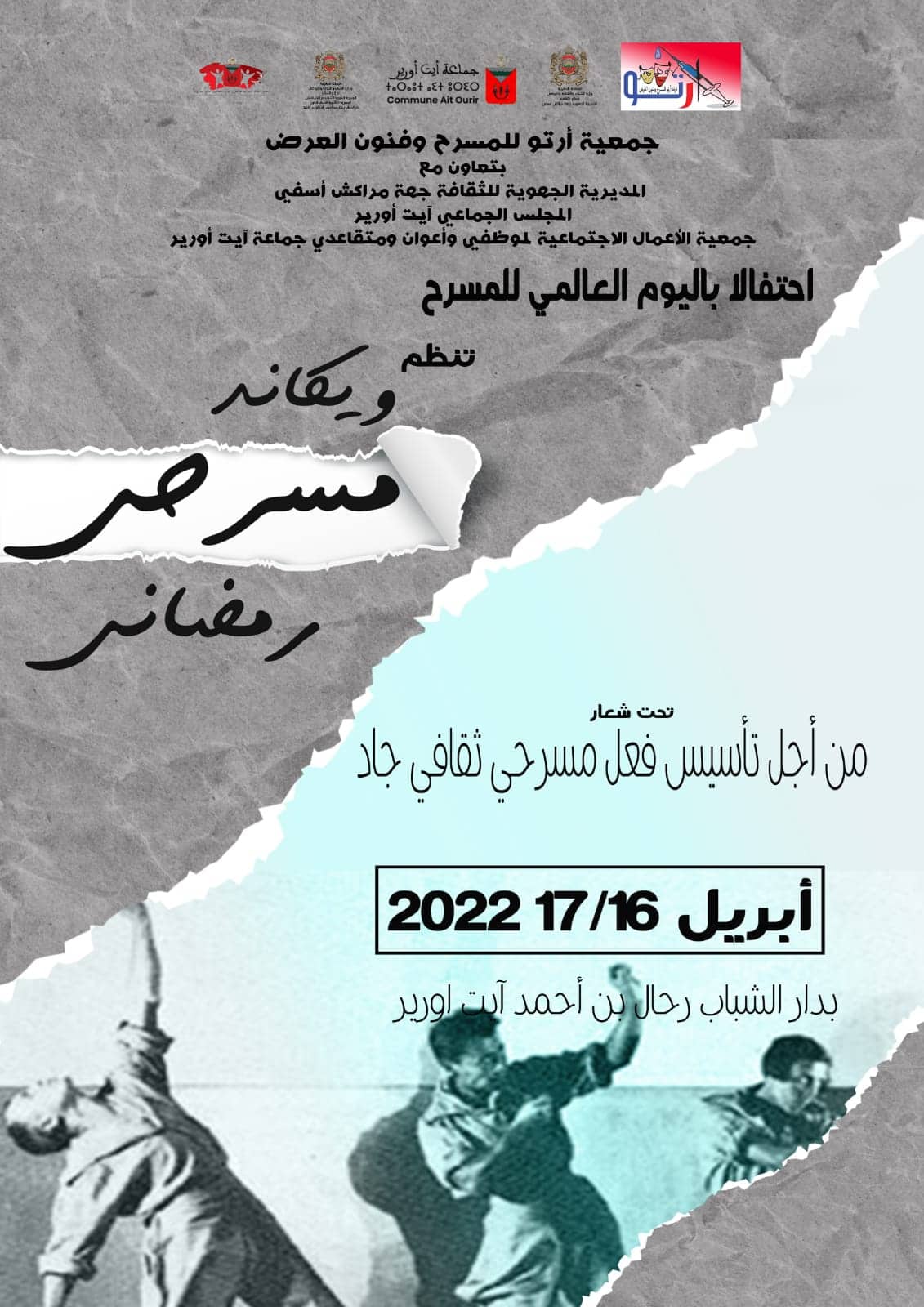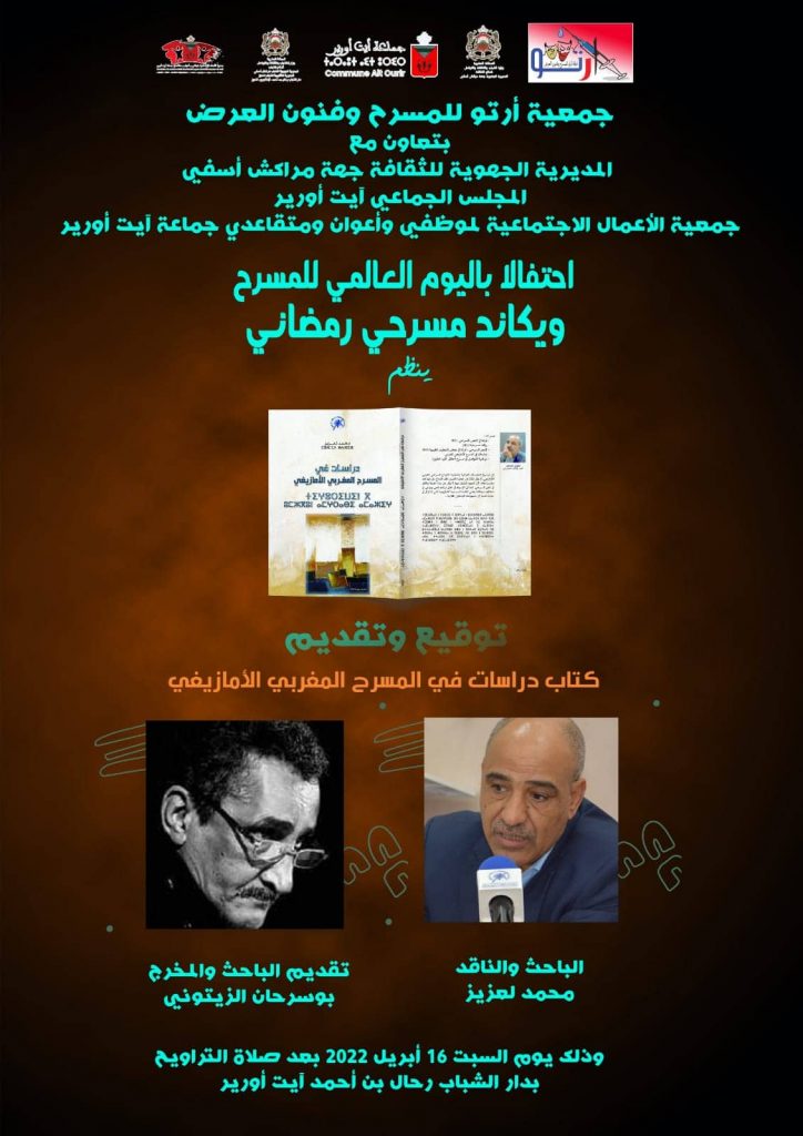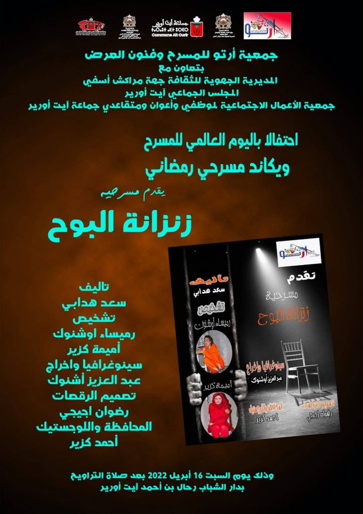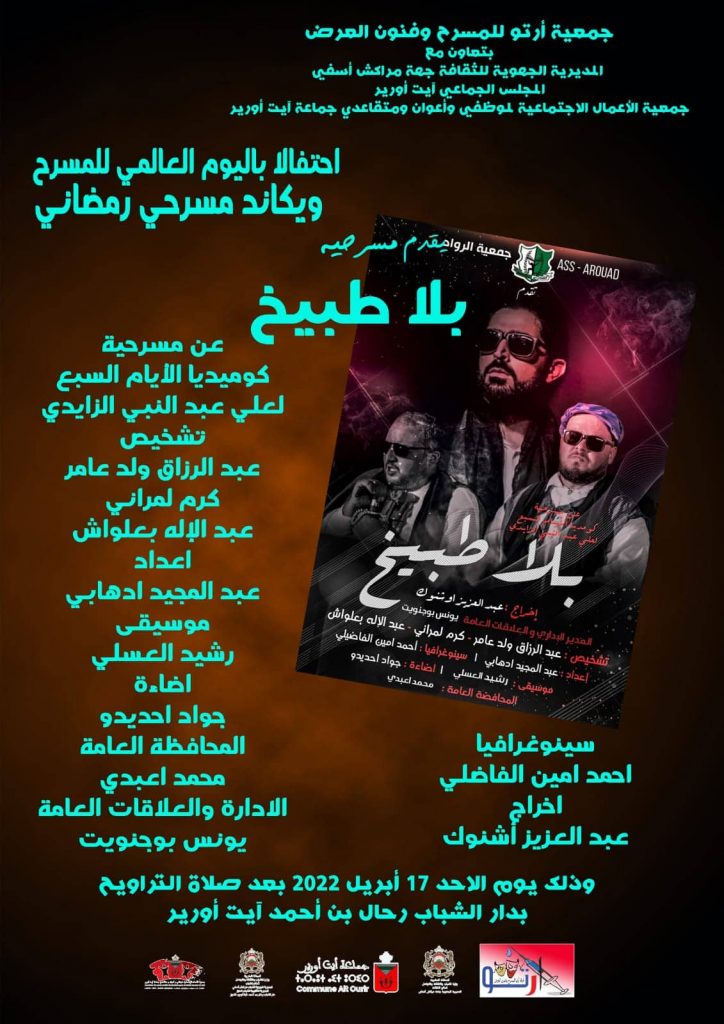 بتعاون مع المديرية الجهوية للثقافة بجهة مراكش أسفي، والمجلس الجماعي بأيت أورير، وجمعية الأعمال الاجتماعية لموظفي وأعوان ومتقاعدي جماعة أيت أورير، تنظم جمعية أرتو للمسرح وفنون العرض بأيت أورير، فعاليات الويكاند المسرحي الرمضاني، احتفالا باليوم العالمي للمسرح تحت شعار :”من أجل تأسيس فعل مسرحي جاد”، أيام 16 و 17 أبريل 2022، بدار الشباب رحال بن أحمد أيت أورير ابتداء من الساعة التاسعة ليلا.