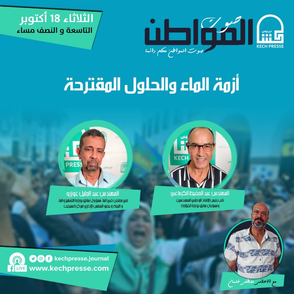 حلقة جديدة من برنامج “صوت المواطن” على KECHPRESSE.COM، تناقش “أزمة الماء والحلول المقترحة” يوم الثلاثاء 18 أكتوبر2022 الساعة التاسعة والنصف 21,30 مساء، وذلك بمشاركة:
