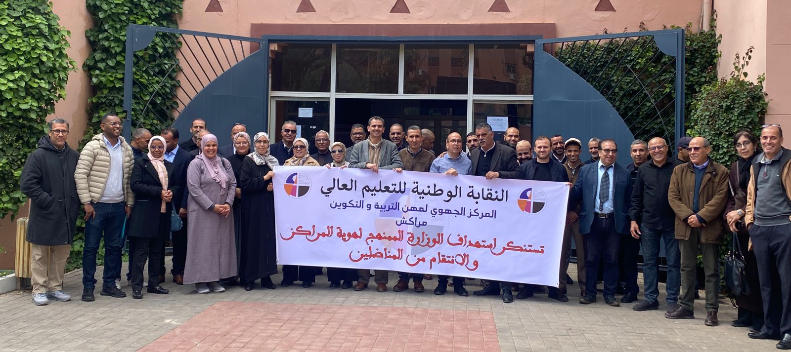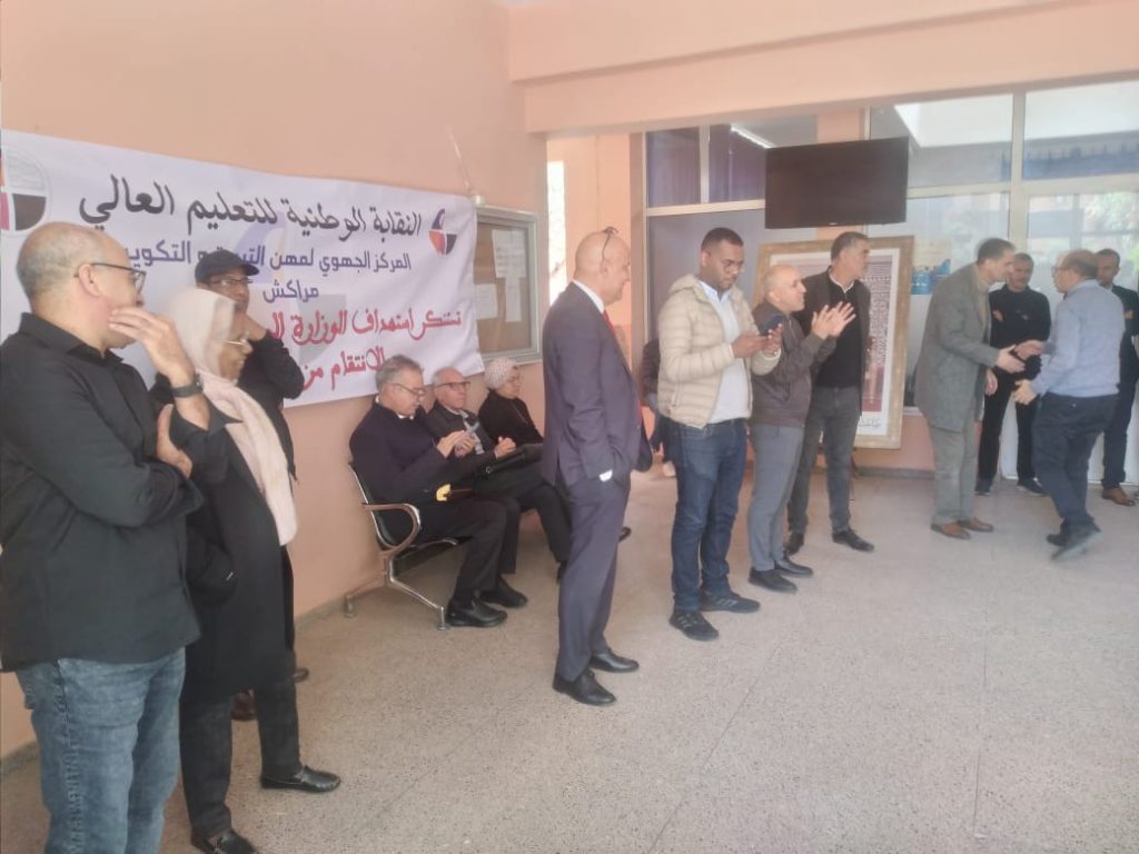 (كش بريس/خاص) ـ تحت شعار : “النقابة الوطنية للتعليم العالي تستنكر استهداف الوزارة الممنهج لهوية المراكز والانتقام من المناضلين”، نفذ المكتب المحلي للتنسيق القطاعي لمراكز تكوين أطر وزارة التربية الوطنية والتابع للنقابة الوطنية للتعليم العالي، يومه الثلاثاء بالمركز الجهوي لمهن التربية والتكوين بمراكش، وقفة احتجاجية استجابة للخطة النضالية التصاعدية المرحلية التي انطلقت بدايتها بإضراب وطني إنذاري، والتي أعلن عنها المكتب الوطني مؤخرا، احتجاجا على سياسة التسويف والمماطلة التي تنهجها الوزارة بخصوص الاستجابة للملف المطلبي.