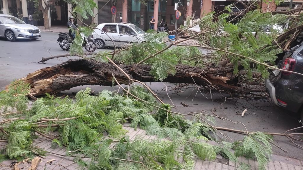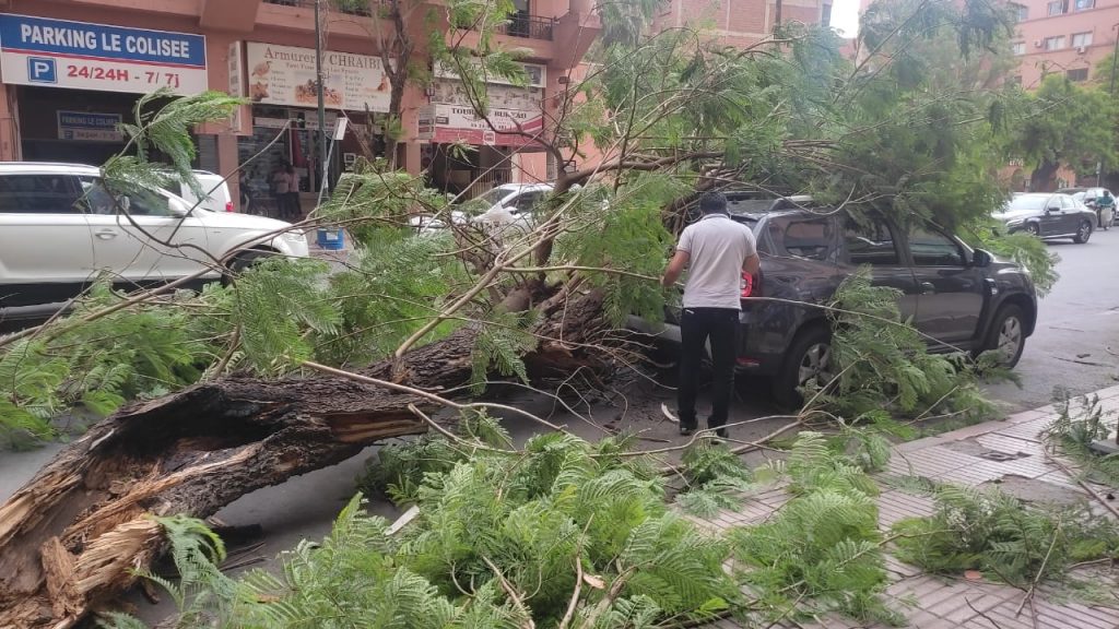 وحسب شهود عيان، من عين المكان، فإن أشجارا معمرة من نوع الجاكرندا Jacaranda وكذا أشجار النخل، قد هوت على سيارات مركونة على الشارع المذكور، مخلفة خسارات فادحة، ما استدعى إخطار السلطات المعنية والمصالح البلدية، التي سارعت إلى إزالة الجدوع من على السيارات، مع معاينة الحدث وتوصيف النازلة.
