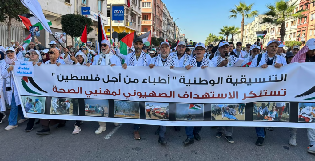 وأشاد المحتجون بصمود المقاومة الفلسطينية وكل العاملين بالقطاع الصحي الغزاوي مع المتطوعين من كل بقاع المعمور، محملين الكيان مسؤولية مصرع الأطقم الطبية في غزة وعناصر الإسعاف وعموم المرضى والجرحى الصامدون في بنايات تحمل اسم المشفيات ولا تتوفر على الحد الأدنى من الخدمات الأساسية.