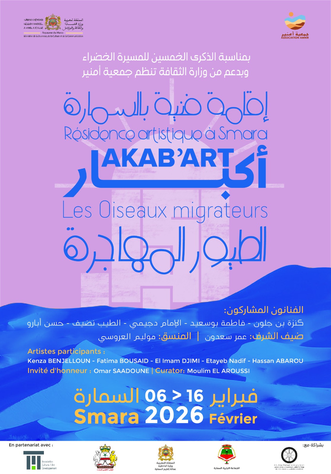 وتأتي هذه المبادرة، التي تحمل عنوان «أكبار الطيور المهاجرة»، بدعم من وزارة الثقافة وبشراكة مع عمالة إقليم السمارة والمجلس الإقليمي والجماعة الترابية للسمارة، إضافة إلى جمعيات ميران لحماية التراث بالسمارة وتيط للثقافة والفن والتنمية بالجديدة، وبتنسيق مع المديرية الجهوية لقطاع الثقافة بجهة العيون الساقية الحمراء.