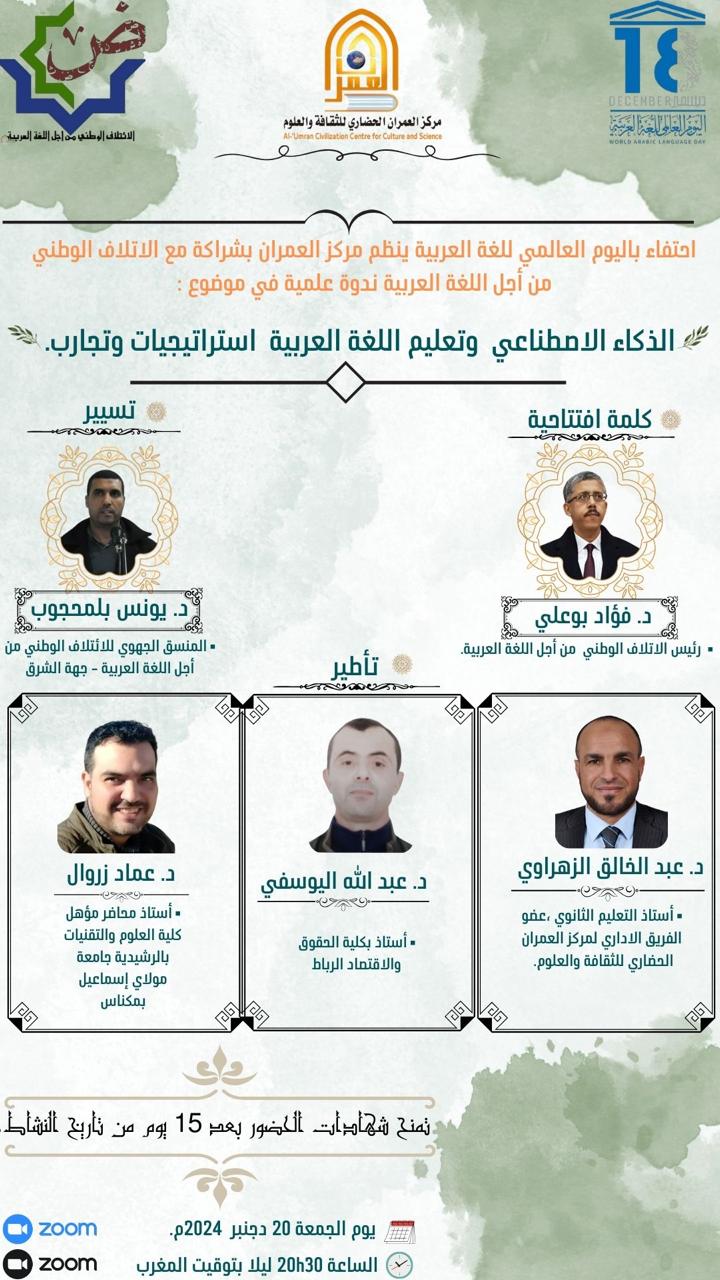 (كش بريس/خاص) ـ في إطار الاحتفاء باليوم العالمي للغة العربية الذي يصادف ال18 من دجنبر كل سنة، ينظم الائتلاف الوطني من أجل اللغة العربية، بتعاون مع مركز العمران الحضاري للثقافة والعلوم، ندوة حول :”الذكاء الاصطناعي وتعليم اللغة العربية ..استراتيجيات وتجارب”، بمشاركة كل من رئيس الائتلاف الدكتور فؤاد بوعلي، والدكتور يونس بلمحجوب رئيس منسقية جهة الشرق، والدكتور عبد الله اليوسفي أستاذ التعليم العالي، والدكتور عماد زروال أستاذ التعليم العالي، والدكتور عبد الخالق الزهراوي، أستاذ التعليم الثانوي. وذلك يوم الجمعة 20 دجنبر 2024 في الساعة الثامنة والنصف ليلا بتقنية الاتصال عن بعد.