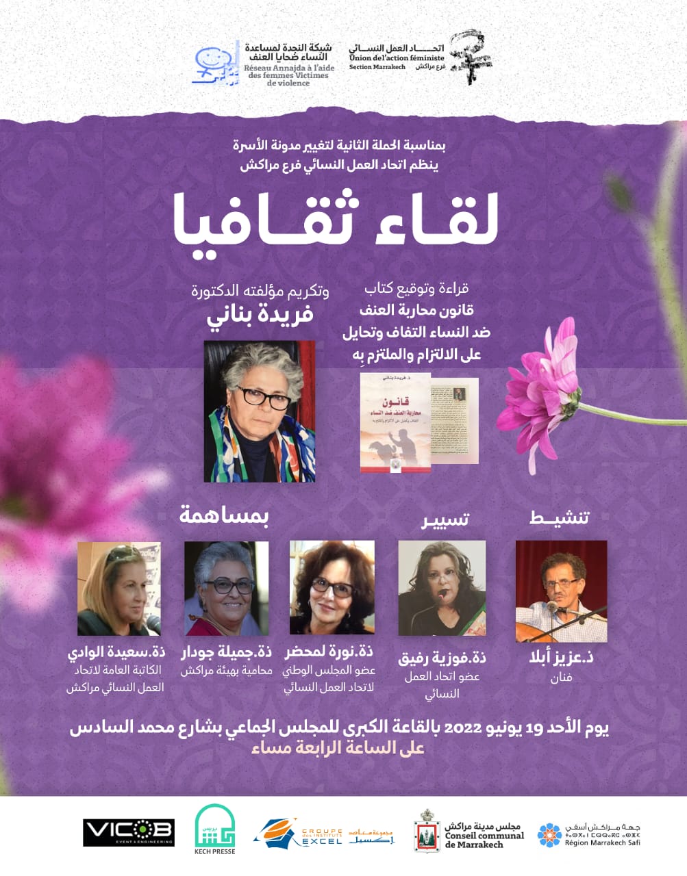 بمناسبة الحملة الوطنية الثانية لتغيير مدونة الأسرة، ينظم اتحاد العمل النسائي فرع مراكش، لقاء ثقافيا، يتضمن قراءة وتوقيع كتاب “قانون محاربة العنف ضد النساء .. التفاف وتحايل على الالتزام والملتزم به” مع تكريم مؤلفته الأستاذة فريدة بناني، وذلك بمساهمة الأستاذات، نورة لمحضر وجميلة جودار وسعيدة الوادي، بتسيير وإدارة الشاعرة فوزية رفيق، ومرافقة موسيقية للفنان عزيز أبلا، يوم الأحد 19 يونيو بالقاعة الكبرى للمجلس الجماعي شارع محمد السادس جليز على الساعة الرابعة مساء.