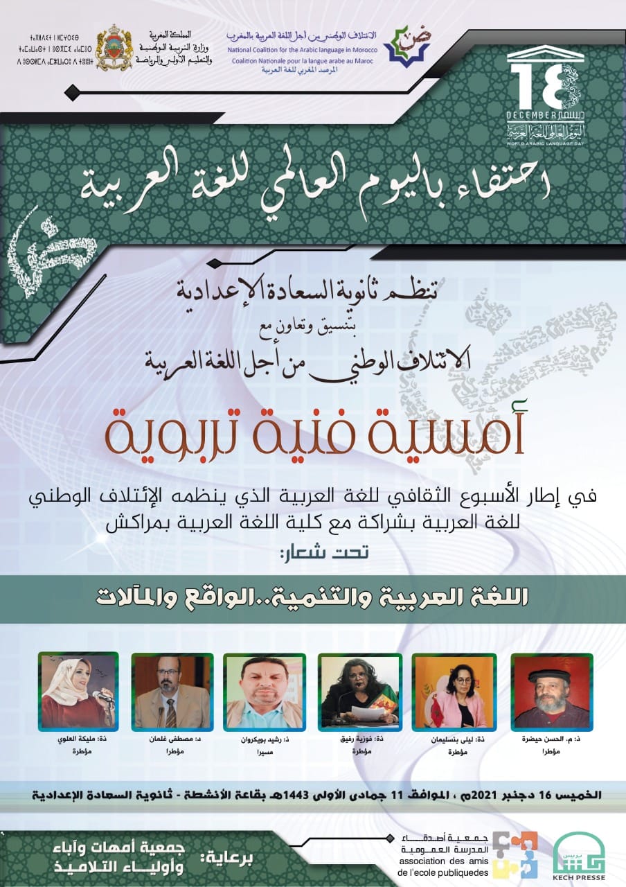 في إطار فعاليات ملتقى اللغة العربية الأول، الذي ينظمها الائتلاف الوطني من أجل اللغة العربية، بشراكة مع كلية اللغة العربية بمراكش، وجمعية أصدقاء المدرسة العمومية، ومؤسسة كش بريس الإعلامية، بمناسبة اليوم العالمي للغة العربية، يلتئم مجموعة من المثقفين والكتاب والفنانين، بثانوية السعادة الإعدادية بالآفاق مراكش، لتنشيط أمسية تربوية ثقافية فنية، وذلك يومه الخميس 16 دجنبر 2021 ، بمشاركة كل من :