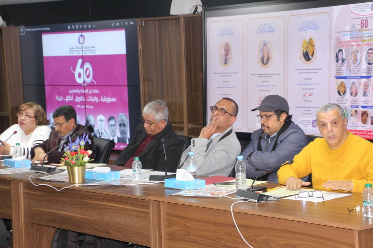 وشَدَّدَ على أن النقابة التي تأسست في 25 يناير 1963 بعد أن اِلتأم جيل الرواد وهم في معمعان النضال الوطني الديمقراطي حيث أنجزوا فعلا نقابيا مهنيا، مُعَدِّدًا عدد من الإشكاليات والقضايا الجوهرية المطروحة راهنا التي تحتاج لكثير من التفكير والنقاش. ليتناول الكلمة كل من: اخشيشن، عدار، العوني، مهني، حيث تم التأريخ والتحقيب لتحولات وانتقالات العمل النقابي للنقابة الوطنية للصحافة المغربية على المستوى التنظيمي والمفاهيمي وأيضا برامج العمل في الدفاع عن الصحافة وحرية التعبير وفي الجوهر البعد الديمقراطي، وفي مرحلة لاحقة قضايا المهنة والمهنيين كما تم التركيز على عدد من الأسئلة ذات الصلة بممارسة الصحافة وأهم المطالب الأساسية في حماية المهنة بكافة تعبيراتها واستعراض مواقف وأدوار ومهام النقابة الوطنية للصحافة المغربية ضمن مسار من الجهد والعمل من أجل ترسيخ القيم النبيلة. وفي انفتاح على الفن والثقافة والإبداع كان حضور المخرج السينمائي عبد الإله الجواهري باعتباره أحد المخرجين المغاربة الذين بصموا السينما بالموقف حيث ارتبط بعوالم الإبداع السمعي البصري وأحد علامات الجامعة الوطنية للأندية السينمائية ( جواسم) والنقد السينمائي كما وَلَجَ الإعلام العمومي التلفزي من خلال برنامج “شاشات”، مسار من الأفلام القصيرة والوثائقية إلى الأفلام الطويلة ( نافذة الجنة–العبد– ولولة الروح — هلا مدريد /فسكا بارصا …رجاء بنت الملاح الأكثر تتويجا في السينما المغربية).