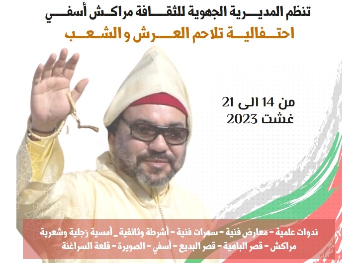 تحت شعار “احتفالية تلاحم العرش والشعب” ، تنظم المديرية الجهوية للثقافة مراكش أسفي والمصالح التابعة لها “احتفالية تلاحم العرش والشعب” من 14 غشت إلى 21 غشت 2023 بمجموعة من الفضاءات الثقافية التابعة لها، ، وذلك احتفالا بالذكرى 44 لاسترجاع إقليم وادي الذهب والذكرى 70 لثورة الملك والشعب 20 غشت والذكرى 60 لعيد الشباب المجيد.