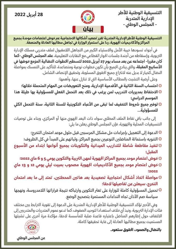 ووفق البيان الذي توصلت “كش بريس” من التنسيقية، فإنه سيتم تنفيذ كل الأشكال الاحتجاجية عبر الاعتصام ل48ساعة، بالإضافة لتنفيذ مقاطعة شاملة للتداريب الميدانية والتكوينات بجميع أنواعها.