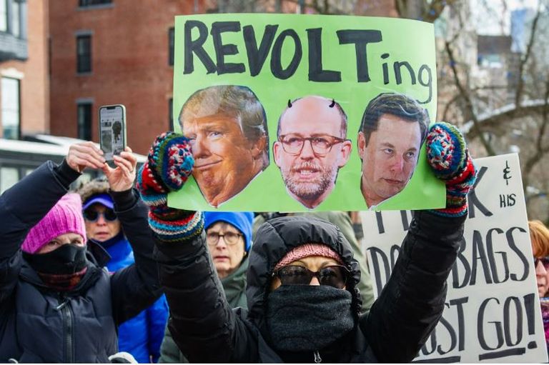 ووردت أنباء عن خروج تجمعات خارج وكالات بيع سيارات تسلا، العلامة التجارية المملوكة لإيلون ماسك، الذي كلّفه ترامب بتقليص حجم القوى العاملة المدنية في الحكومة.