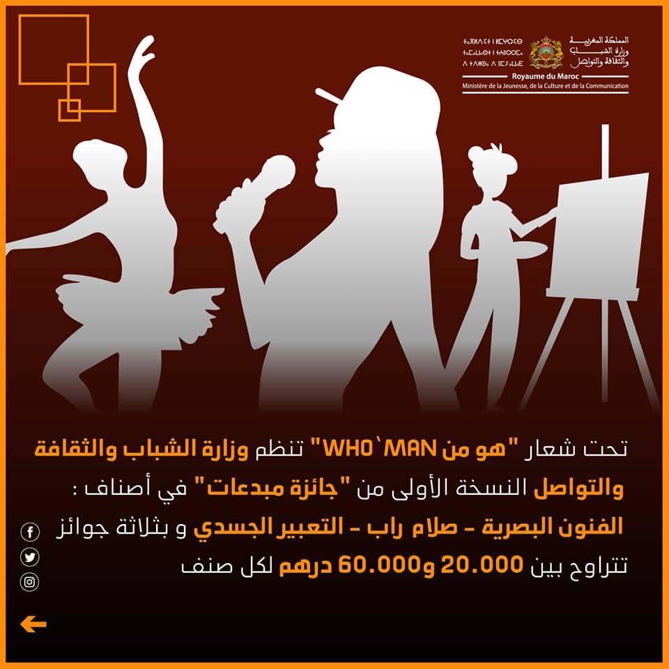 أعلنت وزارة الشباب والثقافة والتواصل، عن تنظيم النسخة الأولى لجائزة مبدعـات برسم سنة 2022 (هو منWHO’ MAN )، وذلك تخليدا لليوم العـــالمي للمرأة والذي يصادف الثامن من شهر مارس من كل سنة، تحت شعار : هو منWHO’ MAN .