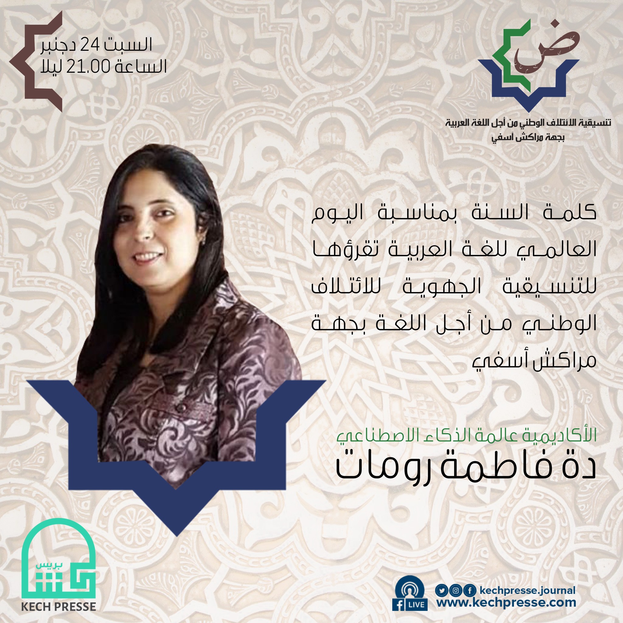 هذا العام، ارتأت التنسيقية الجهوية للائتلاف الوطني من أجل اللغة العربية بمراكش آسفي، أن تباشر المهمة، عالمة الذكاء الاصطناعي الدكتورة فاطمة رومات.