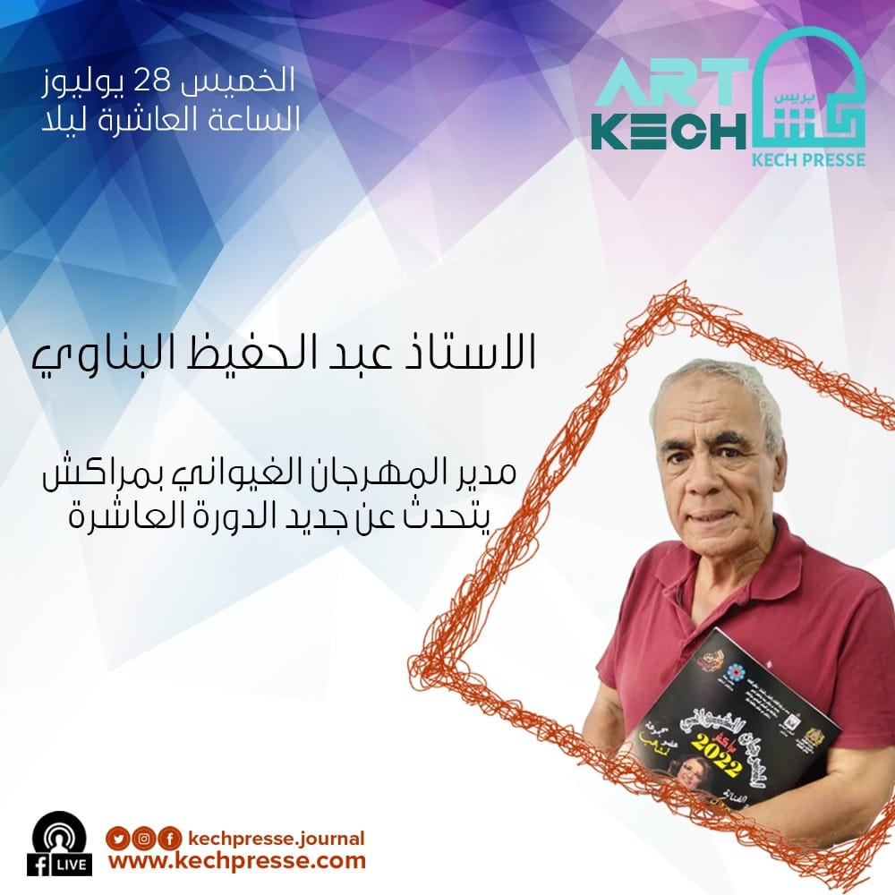 تستضيف “كش بريس” يومه الخميس 28 يوليوز الجاري على الساعة العاشرة 22.00 مساء، ضمن برنامج “ARTKECH” الفنان عبد الحفيظ البناوي، مدير المهرجان الغيواني بمراكش.