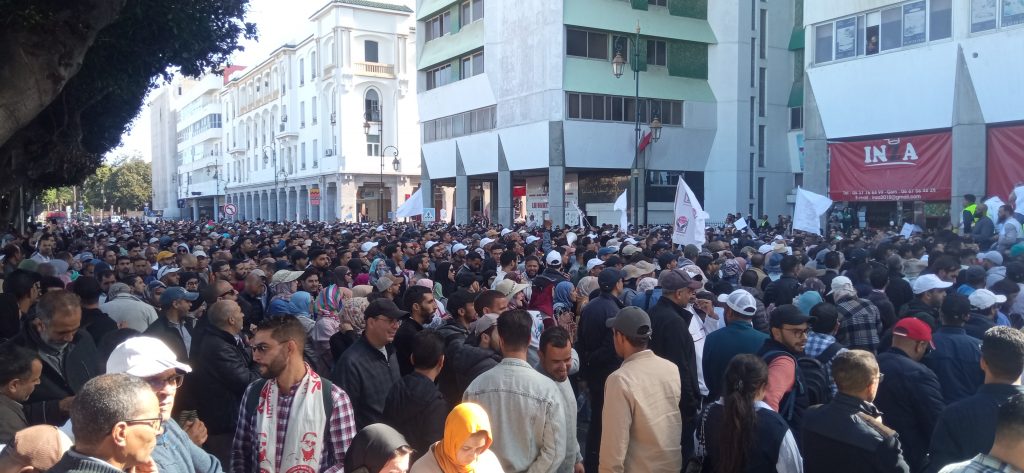 و توافدت الأستاذات والأساتذة بالآلاف من مدن عديدة، للمشاركة في المسيرة الاحتجاجية التي انطلقت من أمام مبنى البرلمان في اتجاه مقر وزارة التربية الوطنية، مرورا بساحة باب الأحد، والتي تأتي في أول أيام الإضراب الوطني الذي يخوضه الأساتذة بمختلف فئاتهم، والذي يستمر لثلاثة أيام، ويعد هو الثالث من نوعه خلال ثلاثة أسابيع، في حين تشهد الساحة التعليمية احتجاجات وإضرابات منذ الكشف عن مشروع النظام الأساسي قبل أزيد من شهر، وقبل ميلاد التنسيق الوطني للتعليم.