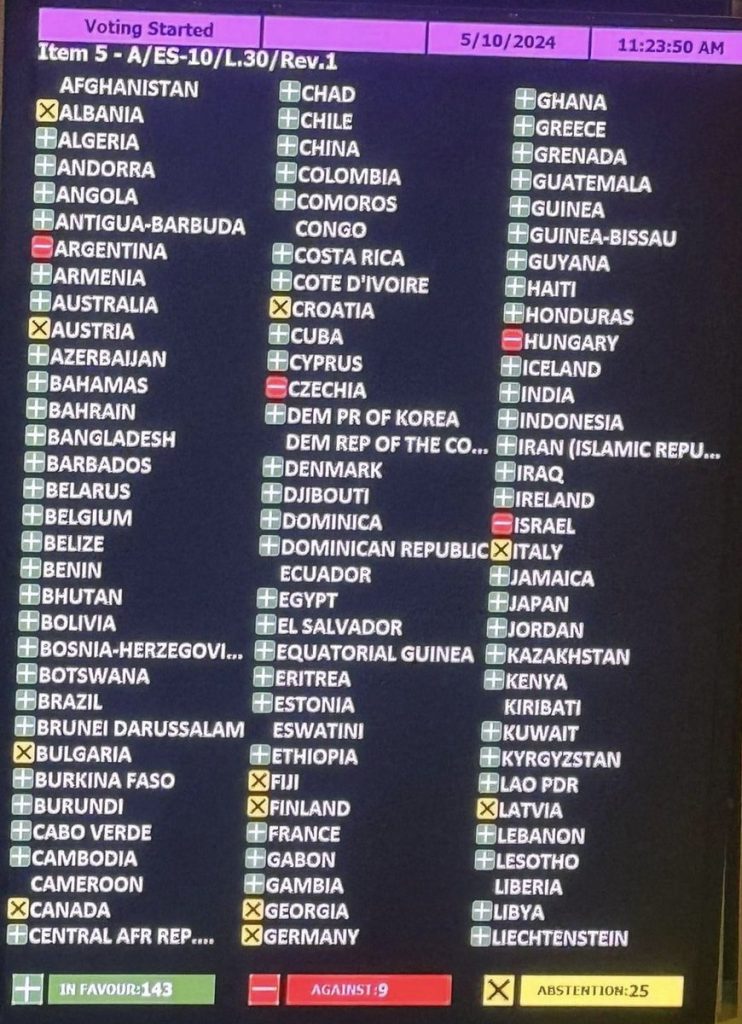 ـ صوت لصالح مشروع القرار 143 دولة و9 دول ضده و25 دولة صوتت بـ”امتناع” ـ