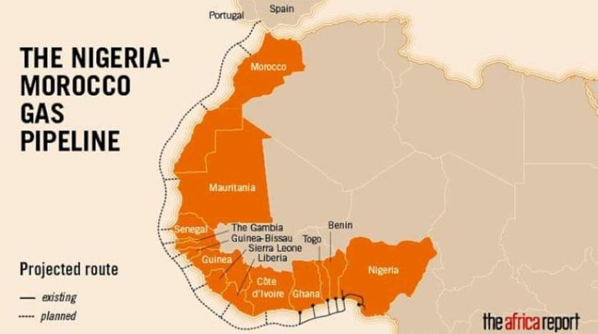 وللتذكير، سيتم تركيب خط أنبوب الغاز على طول ساحل غرب إفريقيا انطلاقا من نيجيريا ومرورا عبر البنين، والطوغو، وغانا، وكوتن ديفوار، وليبيريا، وسيراليون، وغينيا، وغينيا بيساو، وغامبيا، والسنغال، وموريتانيا وصولا إلى المغرب، حيث سيتم ربطه بأنبوب الغاز المغاربي الأوروبي وشبكة الغاز الأوروبية، إذ ستمكن هذه البنية التحتية أيضا من تزويد الدول غير الساحلية كالنيجر وبوركينا فاسو ومالي.