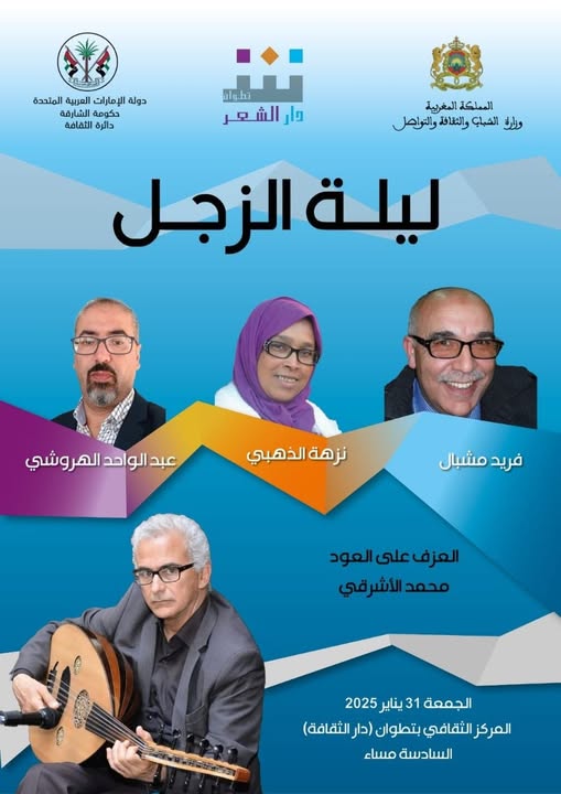 تقيم دار الشعر بتطوان ليلة جديدة من “ليالي الزجل”، يوم الجمعة 31 يناير الجاري، في فضاء المركز الثقافي (دار الثقافة) بتطوان، ابتداء من الساعة السادسة مساء. ويشارك في ليلة الزجل هاته الشاعر الزجال فريد مشبال والشاعرة الزجالة نزهة الذهبي والشاعر الزجال عبد الواحد الهروشي.