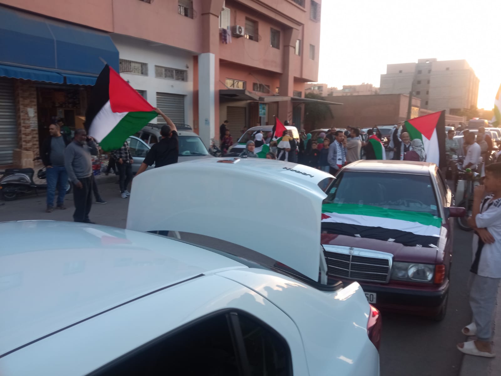 ورفع المحتجون، الذين ينتمون في أغلبهم لجماعة العدل والإحسان، شعارات مناهضة للتطبيع مع الكيان الصهيوني، مطالبة بإسقاطه وإسقاط كل مخرجاته. ورددت حناجر العشرات من المواطنات والمواطنين، الذين قطعوا مسافة قصيرة انطلاقا من حي المحاميد7 في اتجاه المحاميد9، (رددوا) عبارات نارية ضد الآلية العسكرية الصهيونية قاتلة الأطفال والنساء والشيوخ في قطاع غزة، داعين كل شرفاء وأحرار العالم إلى إنقاذ الشعب الغزاوي من آليات البطش الاحتلالي، مؤكدة على التزام الشعب المغربي بنصرته ودعمه.