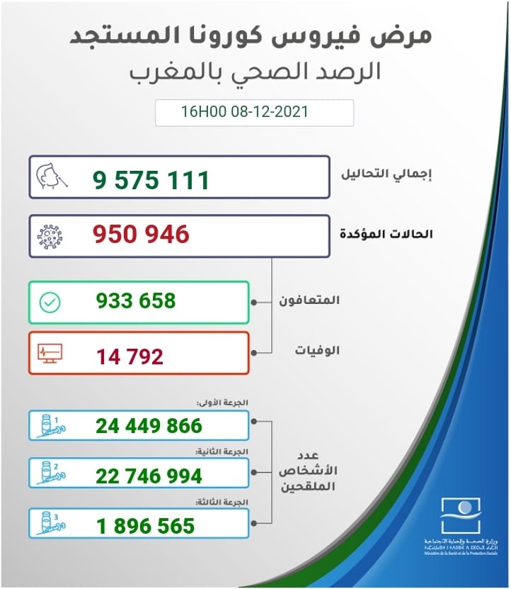 ووفق ذات النشرة، فإن الحصيلة الجديدة للإصابات بالفيروس رفعت العدد الإجمالي لحالات الإصابة المؤكدة بالمملكة إلى 950 ألفا و 946 حالة منذ الإعلان عن أول حالة في 2 مارس 2020، فيما بلغ مجموع حالات الشفاء التام 933 ألفا و 658 حالة، بنسبة تعاف تبلغ 98,2 في المائة، بينما استقر عدد الوفيات إلى 14792 حالة، بنسبة فتك قدرها 1,6 في المائة.