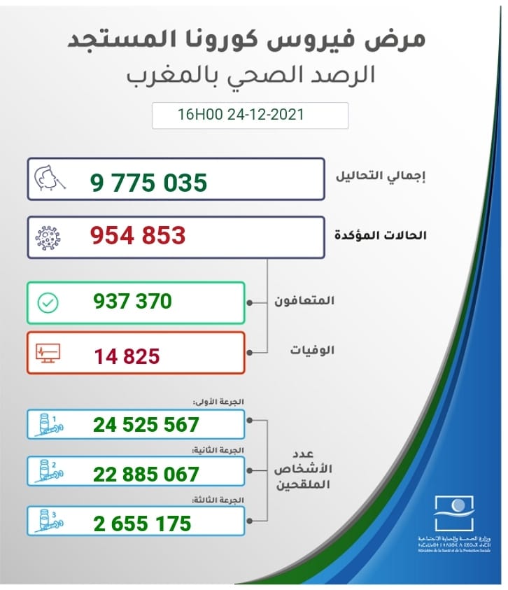 أفادت نشرة كوفيد اليومية التي تصدرها مصالح وزارة الصحة والحماية الاجتماعية، أنه وفق آخر مستجدات الحالة الوبائية ببلادنا خلال ال24 ساعة الأخيرة من يومه الجمعة 24 دجنبر 2021، فإنه تم تسجيل 654 إصابة بفيروس (كوفيد-19)، وبلغ عدد المتعافين 237 شخصا، فيما تم تسجيل حالتي وفاة.
