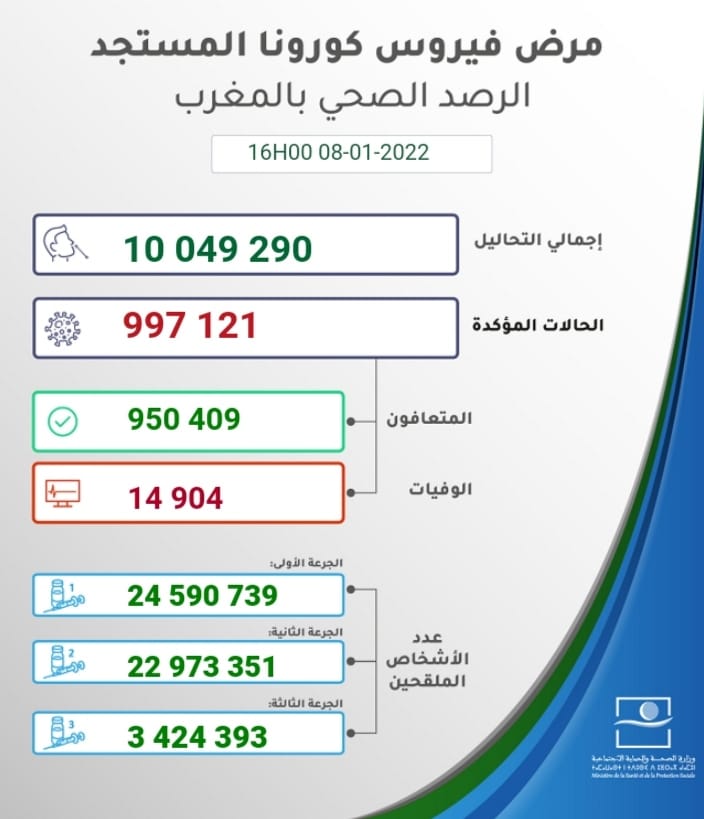 أفادت نشرة كوفيد اليومية التي تصدرها مصالح وزارة الصحة والحماية الاجتماعية، أنه وفق آخر مستجدات الحالة الوبائية ببلادنا، إلى جدود الساعة الرابعة من عصريومه السبت 08 يناير من 2022، فإنه تم تسجيل 7064 إصابة بفيروس (كوفيد-19)، و1644 حالة تعافي وثمان 8 وفيات خلال الـ24 ساعة الأخيرة.