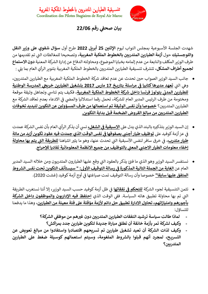 وكان وزير النقل واللوجستيك، قد أكد في ذات المناسبة، على أن لارام كانت قد قررت سنة 2015 المساهمة في تكوين عدد من الربابنة المغاربة بفرنسا من خلال منح ضمانتها لقروض أبرمها المستفيدون من التكوين مع منحهم الأولوية في التشغيل في حال حاجتها إلى هذه الكفاءات، وهو الشيء الذي ترفضه تنسيقية الطيارين المتدربين، معتبرين ذلك خرقا للقانون، ونكوص في حق فئة الطيارين في الحصول على نفس الامتيازات والحقوق التي يكفلها القانون.