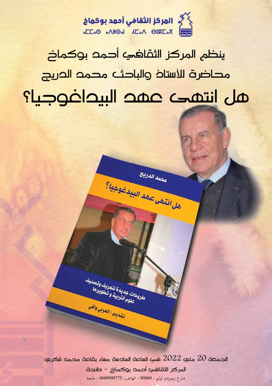 بدعوة من المركز الثقافي أحمد بوكماخ، يحاضر العلامة والمفكر القدير الدكتور محمد الدريج، في موضوع “هل انتهى عهد البيداغوجيا؟”، يوم الجمعة 20 ماي 2022، في الساعة السادسة مساء، بقاعة محمد شكري بالمركز الثقافي أحمد بوكماخ بمدينة طنجة.