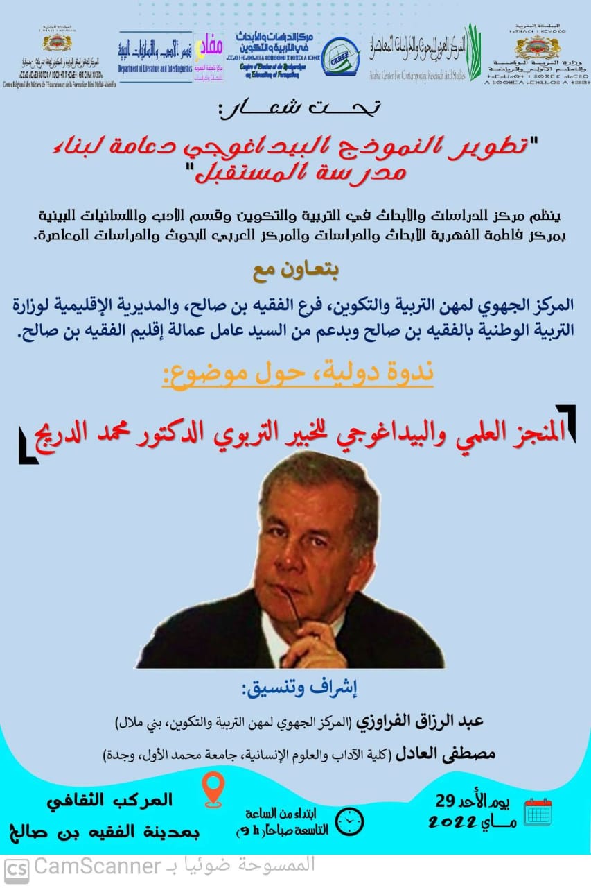 تحت شعار”تطوير النموذج البيداغوجي دعامة لبناء مدرسة المستقبل” ينظم مركز الدراسات والأبحاث في التربية والتكوين وقسم الأدب واللسانيات البينية بمركز التربية الوطنية بمدينة الفقيه بن صالح، وبدعم من السيد عامل عمالة الإقليم، ندوة دولية حول موضوع “المنجز العلمي والبيداغوجي للخبير التربوي الدكتور العلامة محمد الدريج”، بتنسيق الأساتذة عبدالرزاق الفراوزي المدير الجهوي لمهن التربية والتكوين ببني ملال، ومصطفى العادل، كلية الاداب والعلوم الانسانية جامعة محمد الاول بوجدة، وذلك يوم الأحد 29 ماي 2022، ابتداء من الساعة التاسعة صباحا، بالمركب الثقافي بمدينة الفقيه بن صالح.