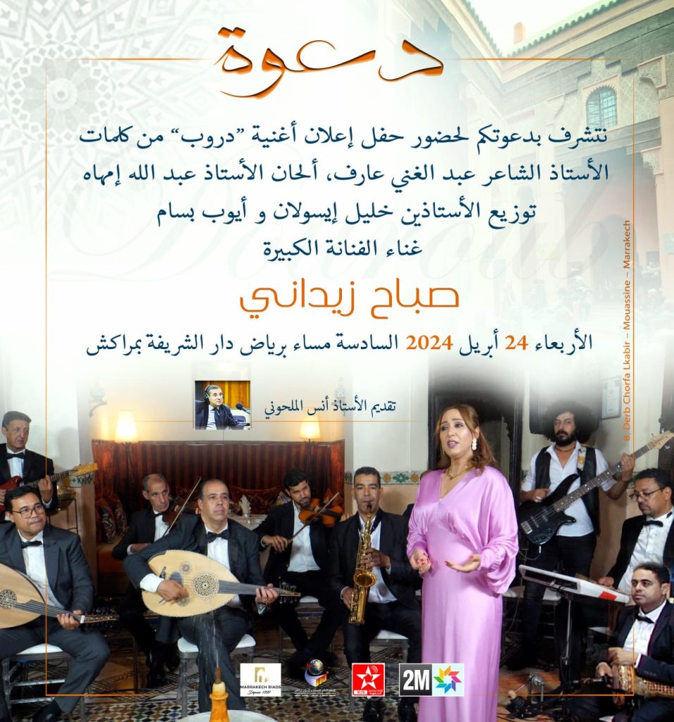 (كش بريس/خاص) ـ تحيي الفنانة صباح زيداني، برياض دار الشريفة بمراكش، حفل إعلان جديد لأغنيتها “دروب” التي كتب كلماتها الشاعر عبد الغني عارف، وقام بتلحينها الفنان عبد الله إمهاه.