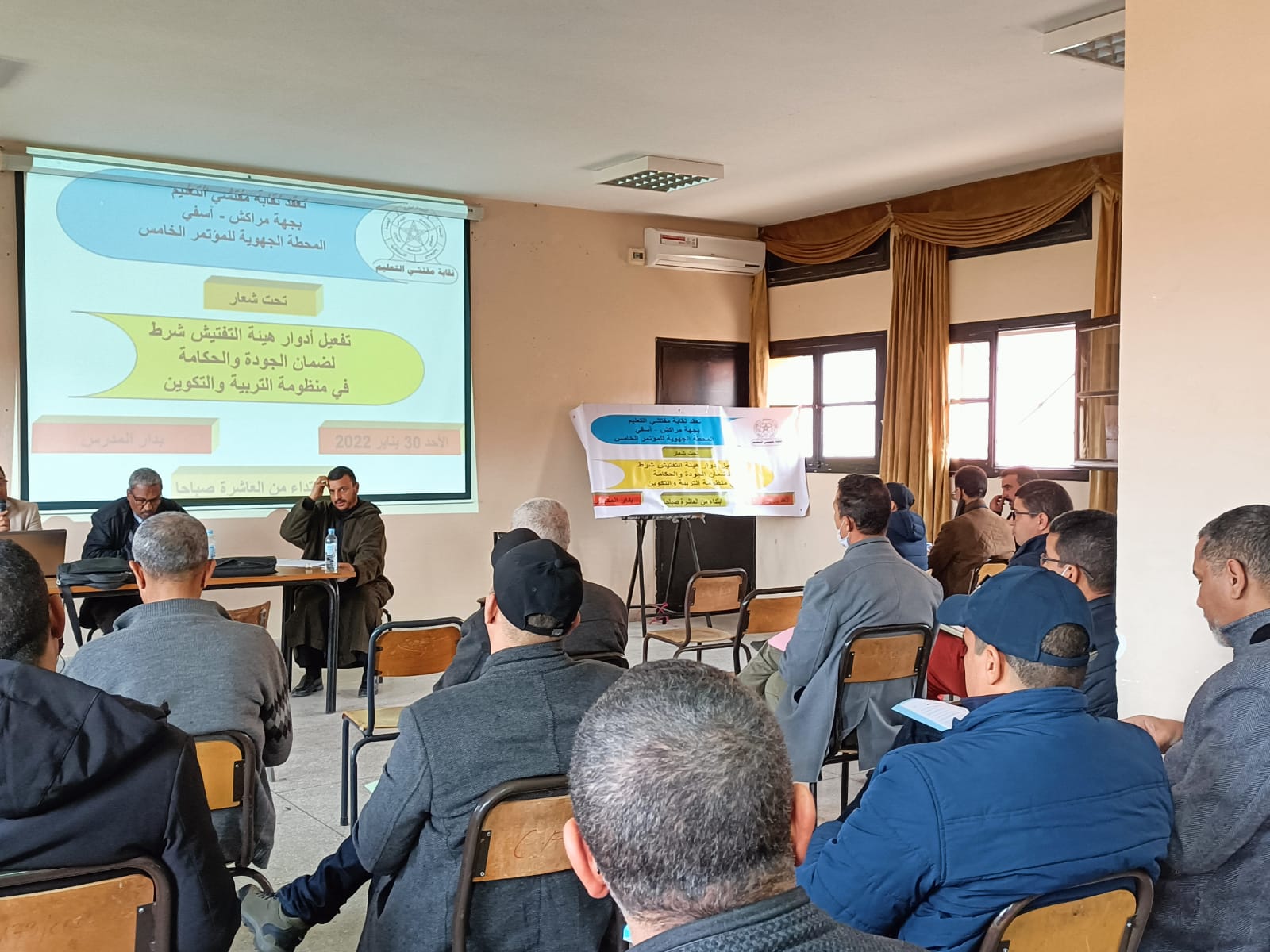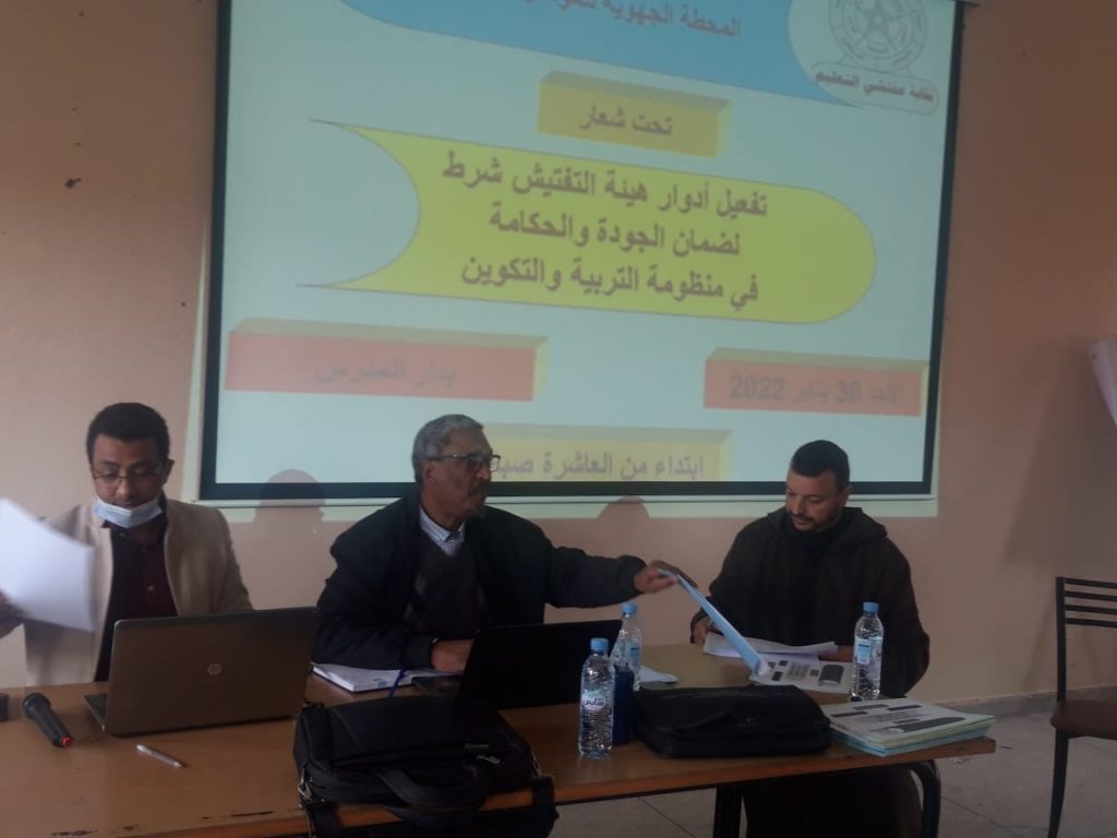 انعقدت يوم 30 يناير 2022 بدار المدرس بمدينة مراكش المحطة الجهوية للمؤتمر الوطني الخامس لنقابة المفتشين. وقد تميزت أشغالها بكلمة افتتاحية من قبل عضو المجلس الوطني للنقابة ذ. أكومي الذي وضع الحاضرين/ات في سياق هذه المحطة وصيغتها . وقد ذكر بالصعوبات التي اعترضت النقابة في تحيين هياكلها بسبب الجائحة وتداعياتها وكذلك الظرف الخاص لانتخاب أعضاء اللجان الثنائية خلال السنة الماضية ، مذكرا بالنجاحات التي حققتها النقابة بفضل التفاف المفتشين/ات حولها.وطًرح مسألة عقد المؤتمر الخامس الذي عرف عدة سيناريوهات واختيارات استقر الرأي أخيرا على هذه الصيغة الأكثر مرونة وسهولة مع إعطاء الجهات أكبر قدر