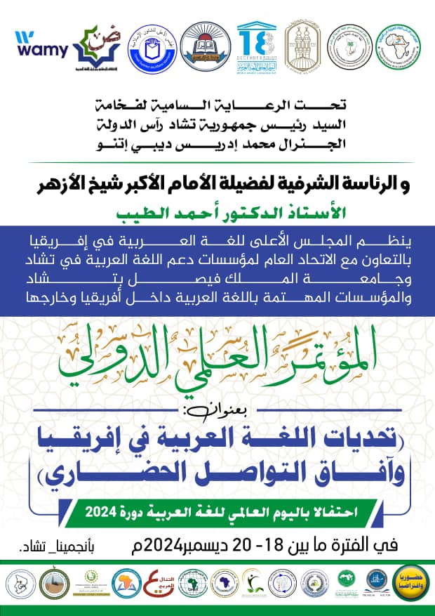 وأكد بلاغ، للمجلس الأعلى للغة العربية بأفريقيا، أنه “بناء على الاجتماع التقييمي الذي جمع رئاسة المجلس الأعلى للغة العربية في أفريقيا مع رئاسة اللجنة العلمية للمؤتمر وهيئاتها الفنية التنسيق المقررين الإعلامية، بهدف تقييم الوضع العام وسير الترتيبات الجارية لتنظيم المؤتمر العلمي الدولي تحديات اللغة العربية في أفريقيا وآفاق التواصل الحضاري، الذي سيعقد بمشيئة الله تعالى في انجامينا، في الفترة ما بين 20/18 ديسمبر 2024م، تحت الرعاية السامية لفخامة السيد رئيس جمهورية تشاد رأس الدولة الجنرال محمد إدريس ديبي إتنو والرئاسة الشرفية لفضيلة الأمام الأكبر شيخ الأزهر الأستاذ الدكتور أحمد الطيب”.