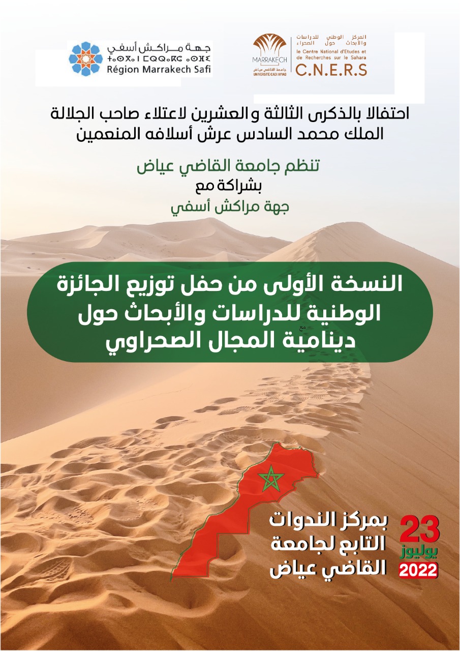 وأفاد بلاغ المركز، توصل موقعنا بنظير منه، أنه “احتفالا بالذكرى الثالثة والعشرين لاعتلاء صاحب الجلالة الملك محمد السادس عرش أسلافه المنعمين، وانسجاما مع الرهانات المؤسساتية الرامية إلى مواكبة الجهود الدبلوماسية والتنموية في سياق موسوم بالكثير من المكاسب والتطورات الملموسة والمؤثرة إيجابا بالأقاليم الجنوبية للمملكة، ووعيا بأهمية البحث العلمي في رأس المال المادي واللامادي لجهات الصحراء المغربية، تنظم جامعة القاضي عياض، بشراكة مع جهة مراكش آسفي، الدورة الأولى من حفل تتويج الفائزين بالجائزة الوطنية للدراسات والأبحاث حول ديناميات المجال الصحراوي، يوم السبت 23 يوليوز 2022 بمركز الندوات التابع للجامعة”.