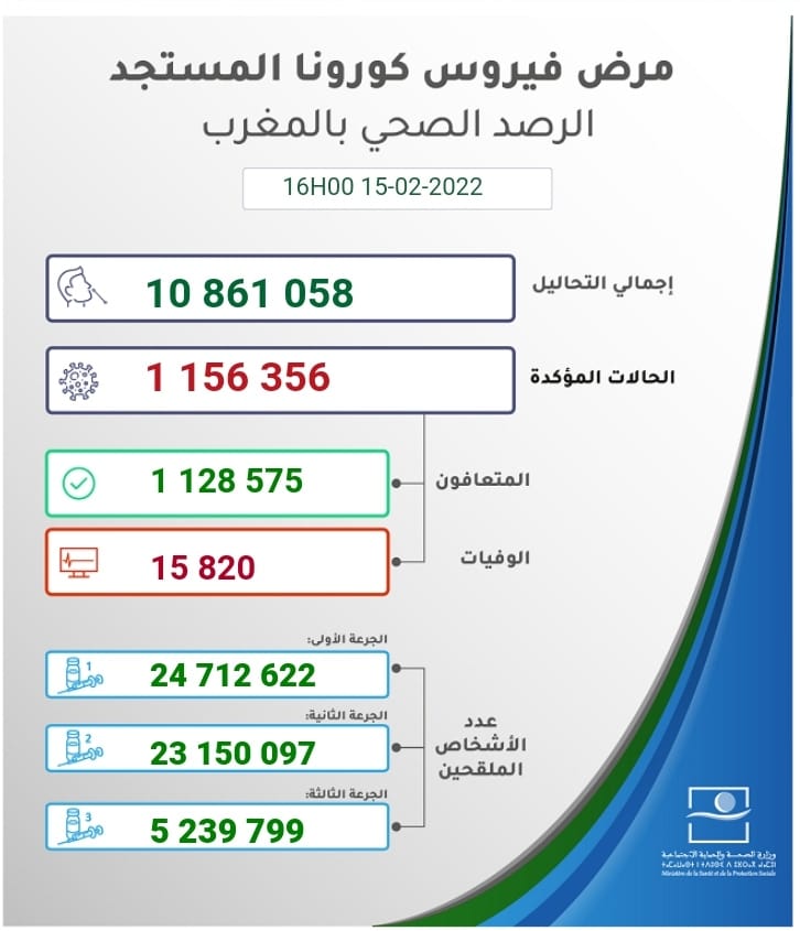 أفادت نشرة كوفيد اليومية التي تصدرها مصالح وزارة الصحة والحماية الاجتماعية، وفق آخر مستجدات الرصد الوبائي ببلادنا، إلى حدود الساعة الرابعة عصر يومه الثلاثاء 15 فبراير الجاري، فقد تم تسجيل 822 حالة جديدة مؤكدة الإصابة ب(كوفيد19) ليصل المجموع إلى 1.156.356 حالة، بينما تم 18 حالة وفاة ليصل المجموع إلى 15.820حالة، بنسبة فتك تصل إلى 1.4 في المائة. في حين تم التأكد من تماثل 2235 للتعافي ليصل العدد الاجمالي إلى 1.128.575 حالة، وأشارت النشرة إلى أن الحصيلة الجديدة للإصابات بالفيروس رفعت العدد الإجمالي لحالات الإصابة المؤكدة بالمملكة إلى مليون و156 ألفا و356 حالة منذ الإعلان عن أول حالة في 2 مارس 2020، فيما بلغ مجموع حالات الشفاء التام المليون و128 ألف و575 حالة بنسبة تعاف تبلغ 6، 97 في المائة، فيما بلغ عدد الوفيات 15 ألفا و820 بنسبة فتك تصل إلى 1.4 في المائة.
