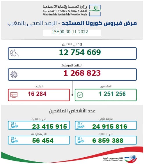أفادت نشرة كوفيد اليومية التي تصدرها مصالح وزارة الصحة والحماية الاجتماعية، وفق آخر مستجدات الرصد الوبائي ببلادنا، إلى حدود الساعة الثالثة من بعد زوال يومه الأربعاء 30 نونبر 2022، أنه تم رصد 184 إصابة جديدة بـ(كوفيد-19)، وتماثل 153 شخصا للشفاء، دون تسجيل أية حالة وفاة ، ليستقر العدد الإجمالي في 1.268.823 حالة، وذلك خلال الـ24 ساعة الأخيرة.