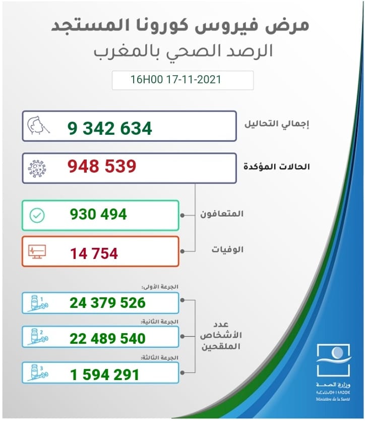 و وفق ذات النشرة، فإن الحصيلة الجديدة للإصابات بالفيروس، رفعت العدد الإجمالي لحالات الإصابة المؤكدة بالمملكة إلى 948 ألف و539 حالة منذ الإعلان عن أول حالة في 2 مارس 2020، فيما بلغ مجموع حالات الشفاء التام 930 ألف و494 حالة بنسبة تعاف تبلغ 98,1 في المائة، بينما ارتفع عدد الوفيات إلى 14 ألف و754 حالة وبنسبة فتك قدرها 1.6 في المائة.