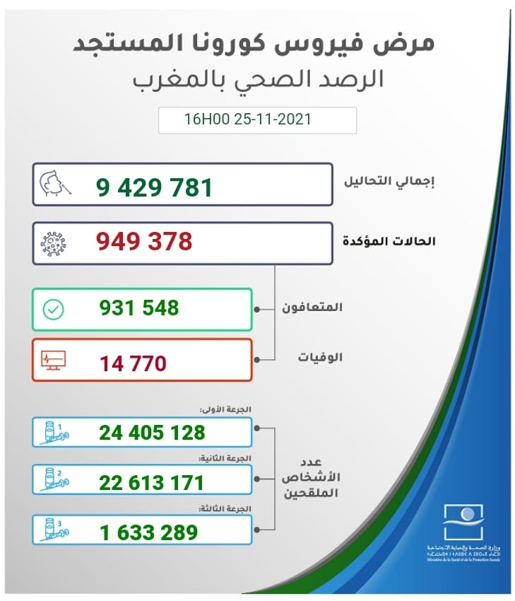 أفادت نشرة كوفيد اليومية التي تصدرها مصالح وزارة الصحة، أنه وفق مستجدات الحالة الوبائية لفيروس كورونا بـالمغرب، خلال الـ 24 ساعة الأخيرة، وذلك إلى حدود الساعة الرابعة بعد زوال يوم الثلاثاء 23 نونبر 2021. فإنه تم تسجيل 115 حالة جديدة مؤكدة الإصابة، ليصل العدد إلى 949.378 حالة، في حين تم تسجيل صفر وفاة ليبقى مجموع الوفيات مستقرا في 14.770 حالة. بنسبة فتك قدرها 1.6 في المائة. كما تم رصد 115 حالة تعافي ليصل المجموع إلى 931.548، بنسبة تعاف تبلغ 98,1 في المائة.