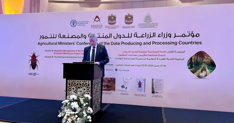 ويهدف مؤتمر وزراء الزراعة في الدول المنتجة والمصنعة للتمور، الذي تنظمه الأمانة العامة لجائزة خليفة لنخيل التمر والابتكار الزراعي ، على مدى ثلاثة أيام، بتعاون مع وزارة التغير المناخي والبيئة الإماراتية ومنظمة الأغذية والزراعة للأمم المتحدة (الفاو) إلى متابعة وتقييم مخرجات مشروع الإدارة المتكاملة لسوسة النخيل الحمراء وإنشاء الهيئة الدولية للتنمية المستدامة للواحات.