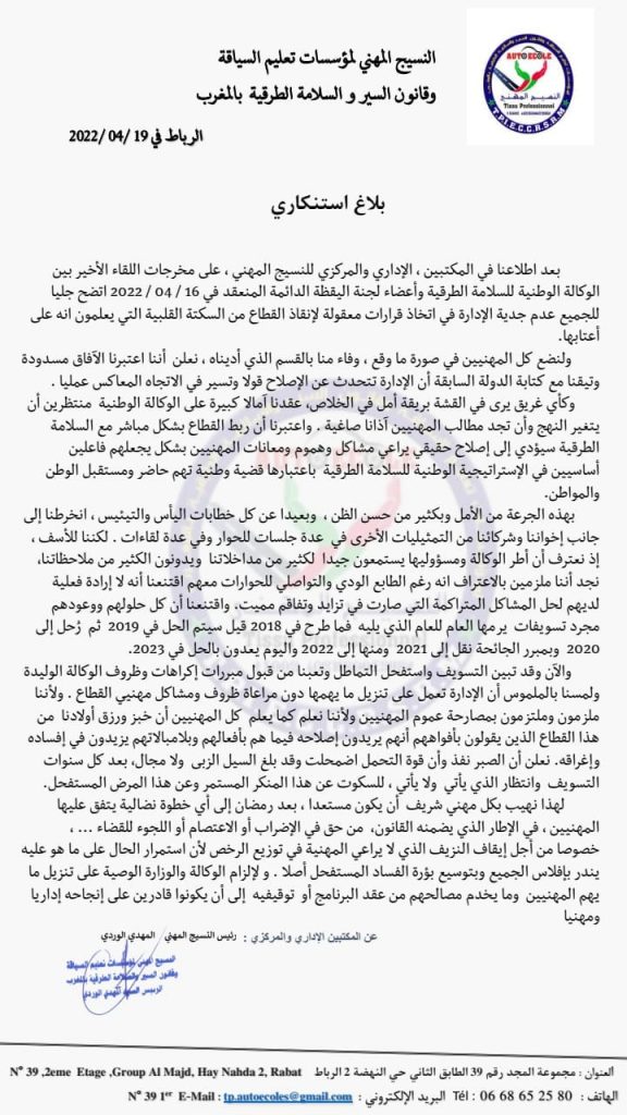 وجاء في بلاغ النسيج المهني لمؤسسات تعليم السياقة وقانون السير والسلامة الطرقية بالمغرب، توصلت “كش بريس” بنسخة منه، أنه بعد “اطلاعنا في المكتبين الإداري والمركزي للنسيج المهنين على مخرجات اللقاء الأخير بين الوكالة الوطنية للسلامة الطرقية وأعضاء لجنة اليقظة الدائمة المنعقد بتاريخ ١٦ أبريل ٢٠٢٢ اتضح جليا للجميع عدم جدية الإدارة في اتخاذ قرارات معقولة لإنقاذ القطاع من السكتة القلبية التي يعلمون أنه على أعتابها”.