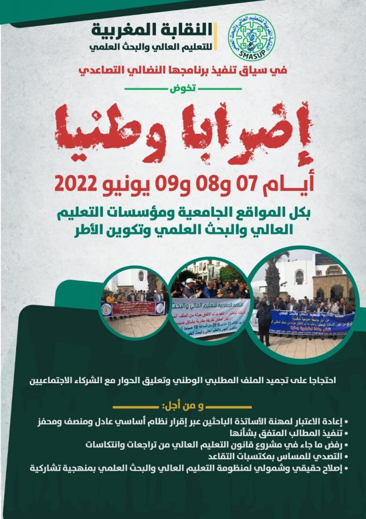 قررت النقابة المغربية للتعليم العالي والبحث العلمي، خوض إضراب وطني أيام الثلاثاء والأربعاء والخميس 07 و 08 و 09 ذو القعدة 1443 ه الموافق ل: 07 و08 و 09 يونيو 2022، تنزيلا لما أسمته ب”لخطة النضالية الوطنية للنقابة المغربية للتعليم العالي والبحث العلمي”، وانسجاما “مع قناعاتها التي تعتبر مطالب الأساتذة الباحثين، ومصلحة منظومة التعليم العالي العمومي تسمو فوق كل اعتبار”.