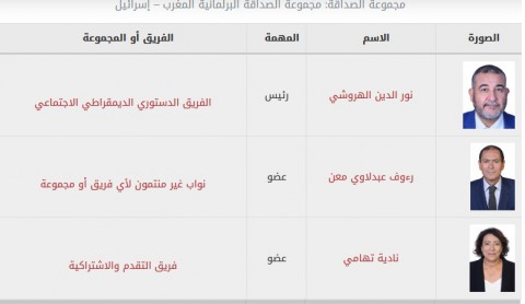 وفي ذات السياق، كشفت مجموعة الصداقة البرلمانية المغربية الإسرائيلية لأول مرة منذ الإعلان الرسمي عن توقيع اتفاقية ابراهام، عن أسماء أعضائها التي تشمل مختلف الكتل البرلمانية بالإضافة إلى غير المنتسبين، باستثناء ممثلي فريق التجمع الوطني للأحرار، والمجموعة النيابة للعدالة والتنمية، وهم بالأساس يمثلون مختلف الفرق البرلمانية في المجلس بالإضافة إلى النواب غير المنتسبين.