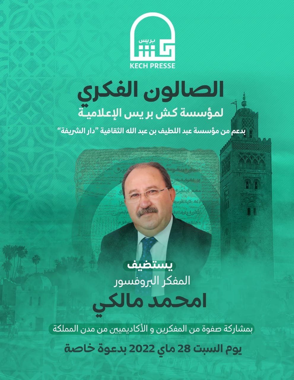 تحتفي مؤسسة “كش بريس” الإعلامية، يومه السبت 28 ماي 2022، انطلاقا من الساعة الخامسة 17.00 مساء، بإحدى الإقامات السياحية والثقافية الفخمة، ضمن صالونها الفكري والأكاديمي، بأحد أهم علماء الفقه الدستوري بالمغرب والعالم العربي، البروفيسور امحمد مالكي.
