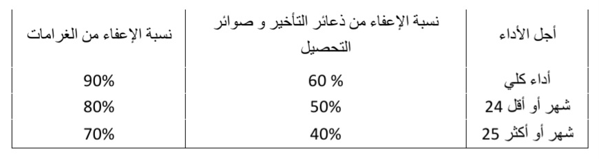 وحسب المصدر ذاته، فإن هذا الاجراء يهم جميع المقاولات المدينة للصندوق و يشمل الاعفاء الجزئي من ذعائر التأخير والغرامات و صوائر تحصيل الديون المرتبطة بهذه الفترة، حسب النسب التالية: