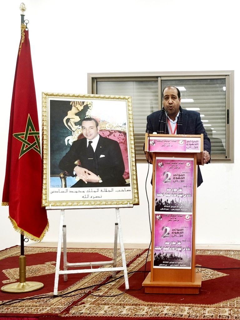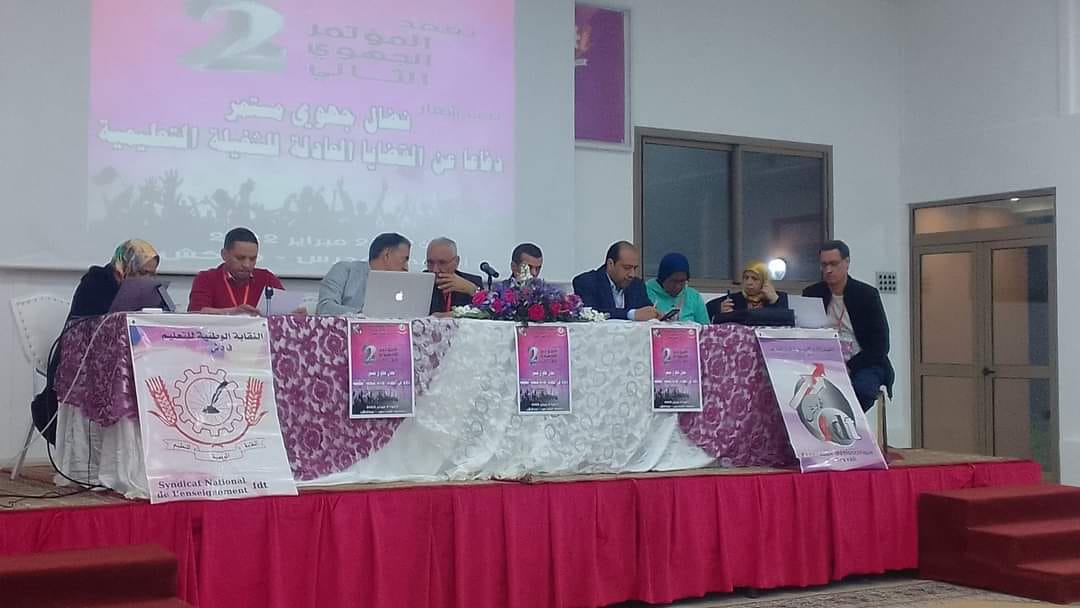 المكتبين الإقليمي بمراكش والجهوي المنضويان تحت لواء الفيدرالية الديمقراطية للشغل، بكلمة ترحيبية بكل الحاضرين، مذكرا بأن هذه المحطة التنظيمية تأتي على بعد أيام من الذكرى السادسة والخمسين ( 56 ) لتأسيس النقابة الوطنية للتعليم، بتاريخ 20 فبراير سنة 1966، ذكرى يتم استحضارها اليوم بقيم الوفاء وبنفس تنبني على التأمل والتجديد واستشراف المستقبل من خلال هذا المسار التنظيمي الدائم والزخم النضالي والسجل الحافل الممتد المكتوب بعناوين التضحيات الجسام والكفاح المرير الذي دشنه جيل الرواد، جيل المؤسسين الرعيل الأول بُنات النقابة الوطنية للتعليم مؤسسوها في زمن لم يكن بالسهل أبدا، الزمن الحارق الملتهب، الذي حولته الإرادة الصلبة القوية إلى زمن تحقيق المطامح والإرادات عبر كل هذه الحقبة الزمنية إلى أن وصلت الطبقة العاملة اليوم إلى زمن تحقيق ما جاءت به مضامين البرنامج التنموي الجديد.