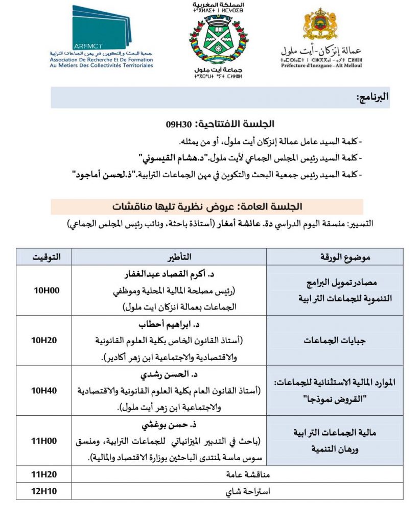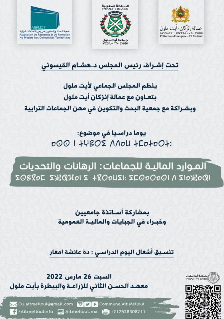 تحت عنوان “الموارد المالية للجماعات: الرهانات والتحديات”، يلتئم بمعهد الزراعة والبيطرة بأيت ملول، يوم السبت 26 مارس 2022، يوم دراسي هام، من تنظيم المجلس الجماعي لأيت ملول بتعاون مع عمالة إنزكان أيت ملول وبشراكة مع جمعية البحث والتكوين في مهن الجماعات الترابية .