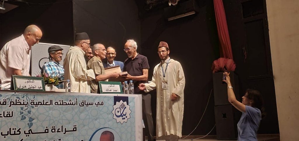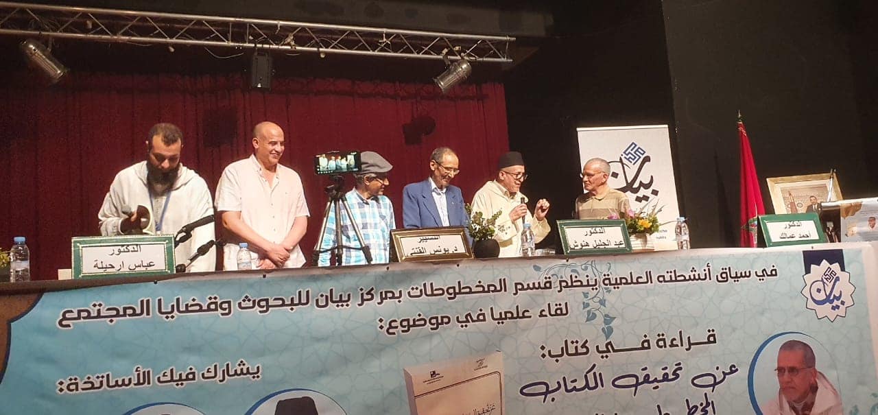 نظم مركز بيان للبحوث وقضايا المجتمع، بمدينة الحمراء، لقاء علميا مائزا وهادفا ، لقراءة المؤلف الجديد للدكتور عباس أرحيلة :”عن تحقيق المخطوط وما إليه “وشارك في هذه القراءة العلمية المفتحصة كل من الدكاترة :د. أحمد عمالك،د. عبد الجليل هنوش، د. عبد الوهاب الأزدي، الذين قدموا الكتاب، ومن خلاله تحدثوا عن مجهودات الدكتور عباس ارحيلة في مجال التحقيق تنظيرا وتطبيقا، كما أجمعوا على أن الكتاب يعتبر دستورا وعمدة لكل الباحثين، وبخاصة،المقبلين على تحقيق المخطوط، والمهتمين بعلم المخطوطات.