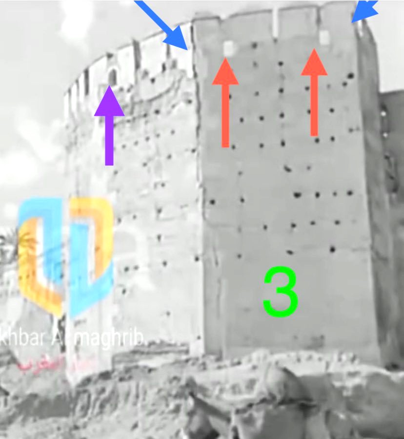 • السهمان الأزرقان يشيران إلى نافذتين في زاوية البرج.
