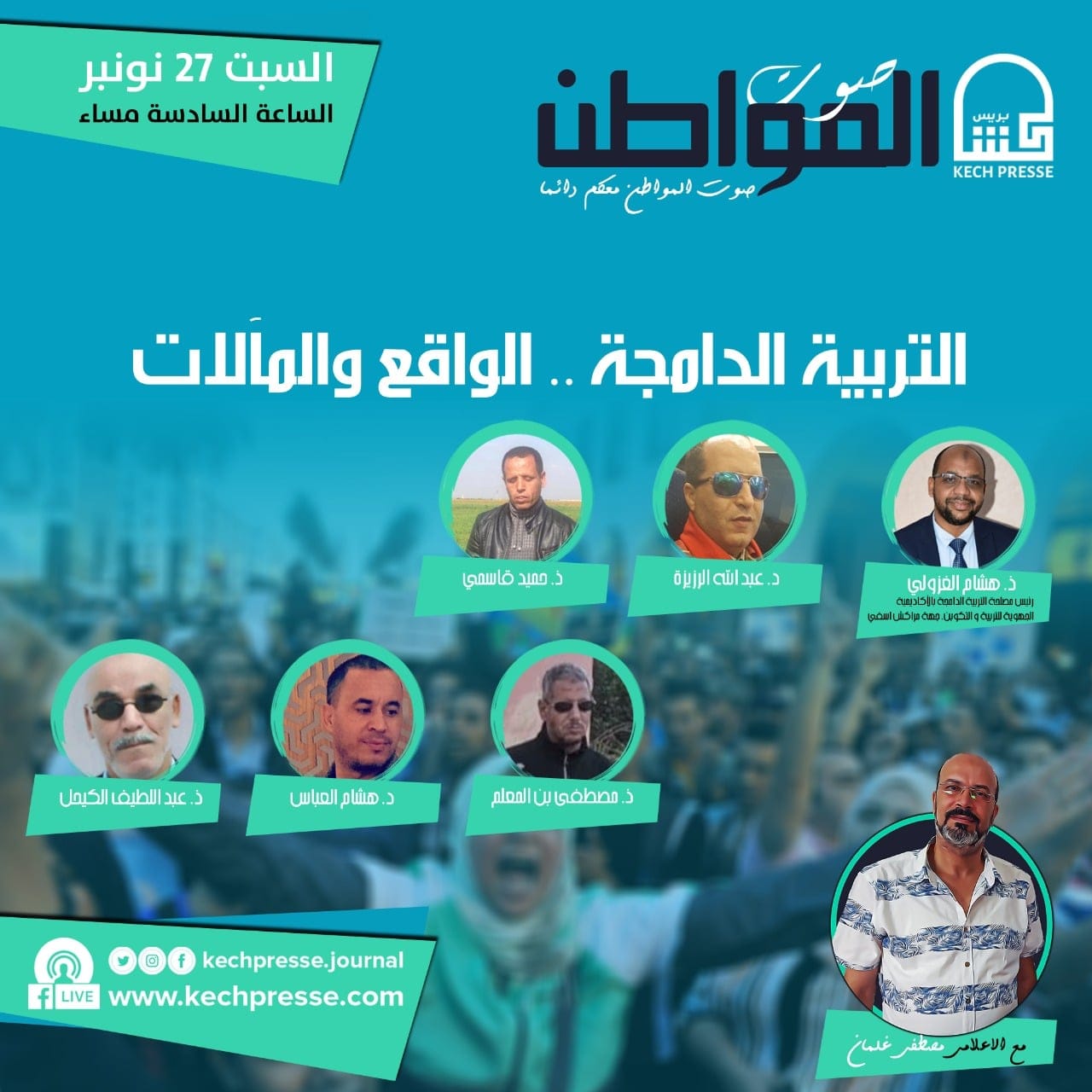 يلتقي جمهور “كش بريس” يومه السبت 27 نونبر الجاري، في تمام الساعة السادسة 18,00 مساء، مع جديد برنامج “صوت المواطن” على KECHPRESSE، في موضوع راهني هو :” التربية الدامجة .. الواقع والمآلات”.